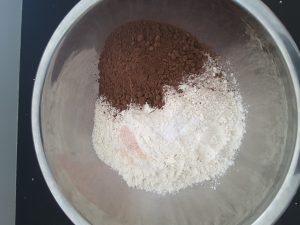 後からふるいを使いますがココアパウダーはダマになりやすいので、出来ればボールに入れる前に別であらかじめふるっておくことをおススメします。その方がボールの中で混ぜる時に小麦粉とキレイに混ざってくれますよ。やはりこんなことでも手を抜いてはいけませんね。苦笑