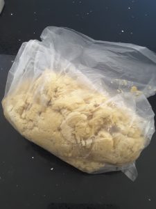 そのまま袋に入れます。ラップでくるんでも良いですが下の写真のように平らにして冷蔵庫で寝かせると後の作業が楽になるので、私は袋に入れてこねずに手でパンパンと軽くたたきながら生地を均等の厚さにして冷蔵庫に入れます。